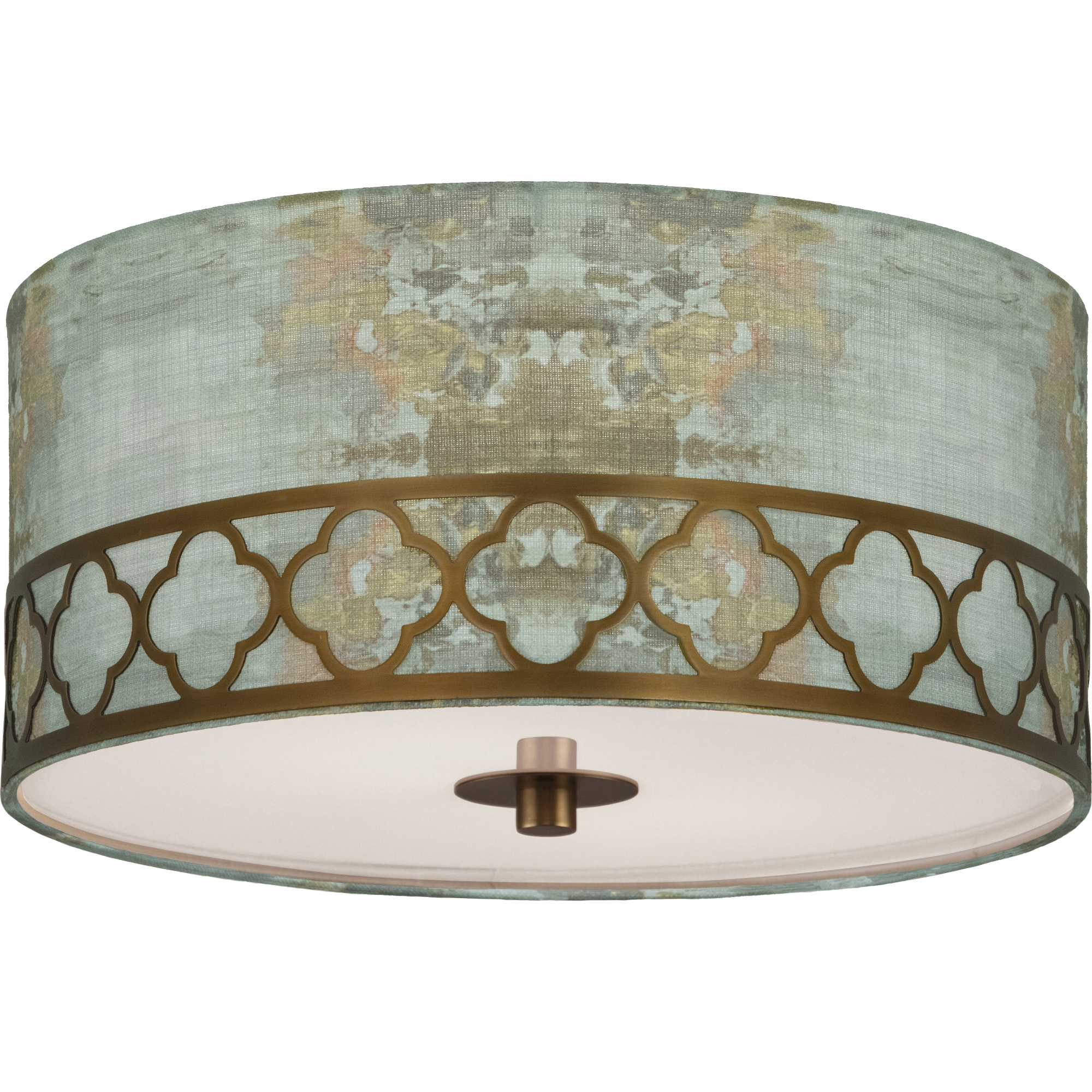 Weathered Brass Finish Addison Flushmount With Bone Dupoini Fabric Shade with Decorative Metal Band