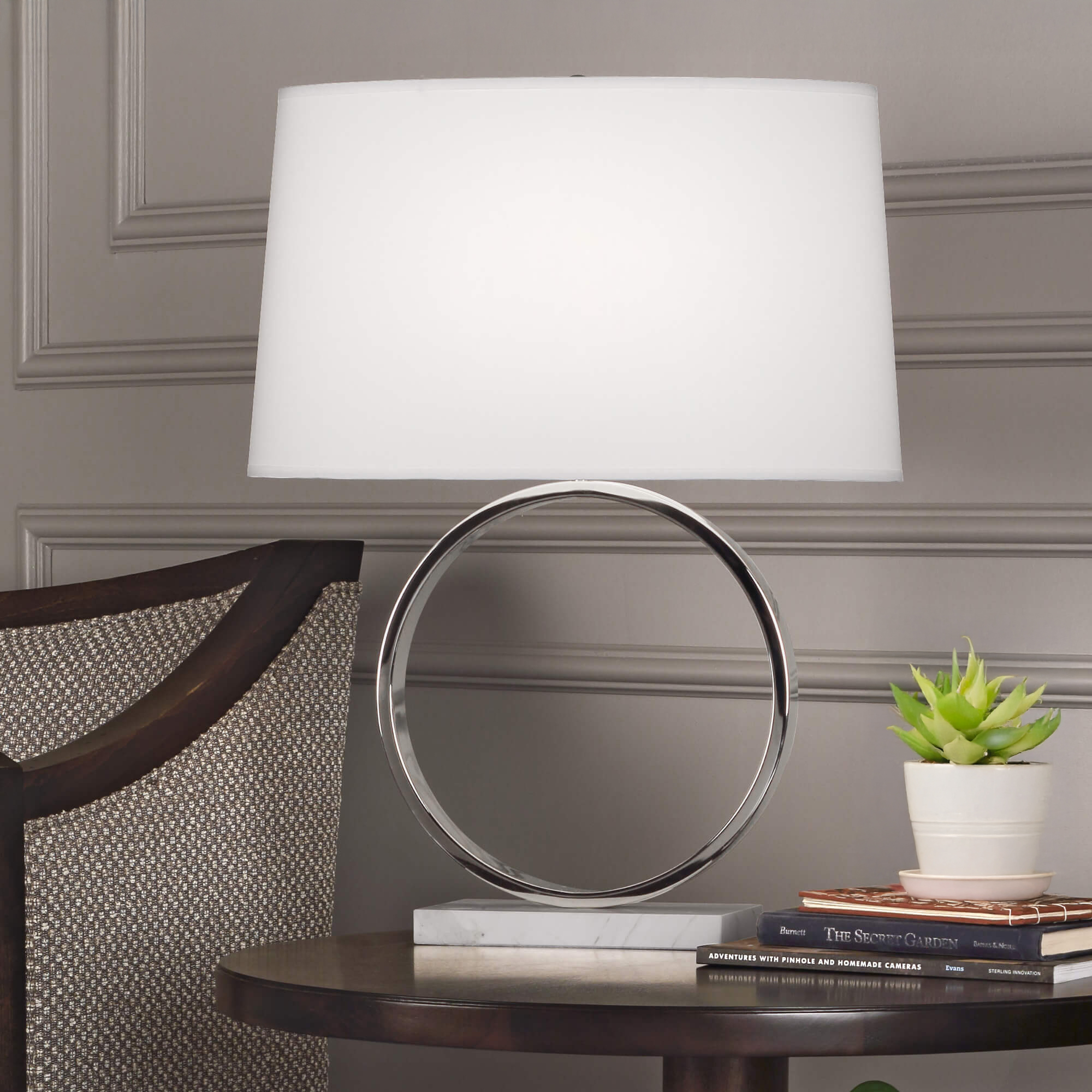 Our Logan collection features simple, stacked geometry that creates a well-balanced design. Featuring a combination of metal and stone, Logan has an artistic tension that makes it a great choice for contemporary settings! - Polished Nickel Finish Logan Table Lamp With Ascot White Fabric Shade
