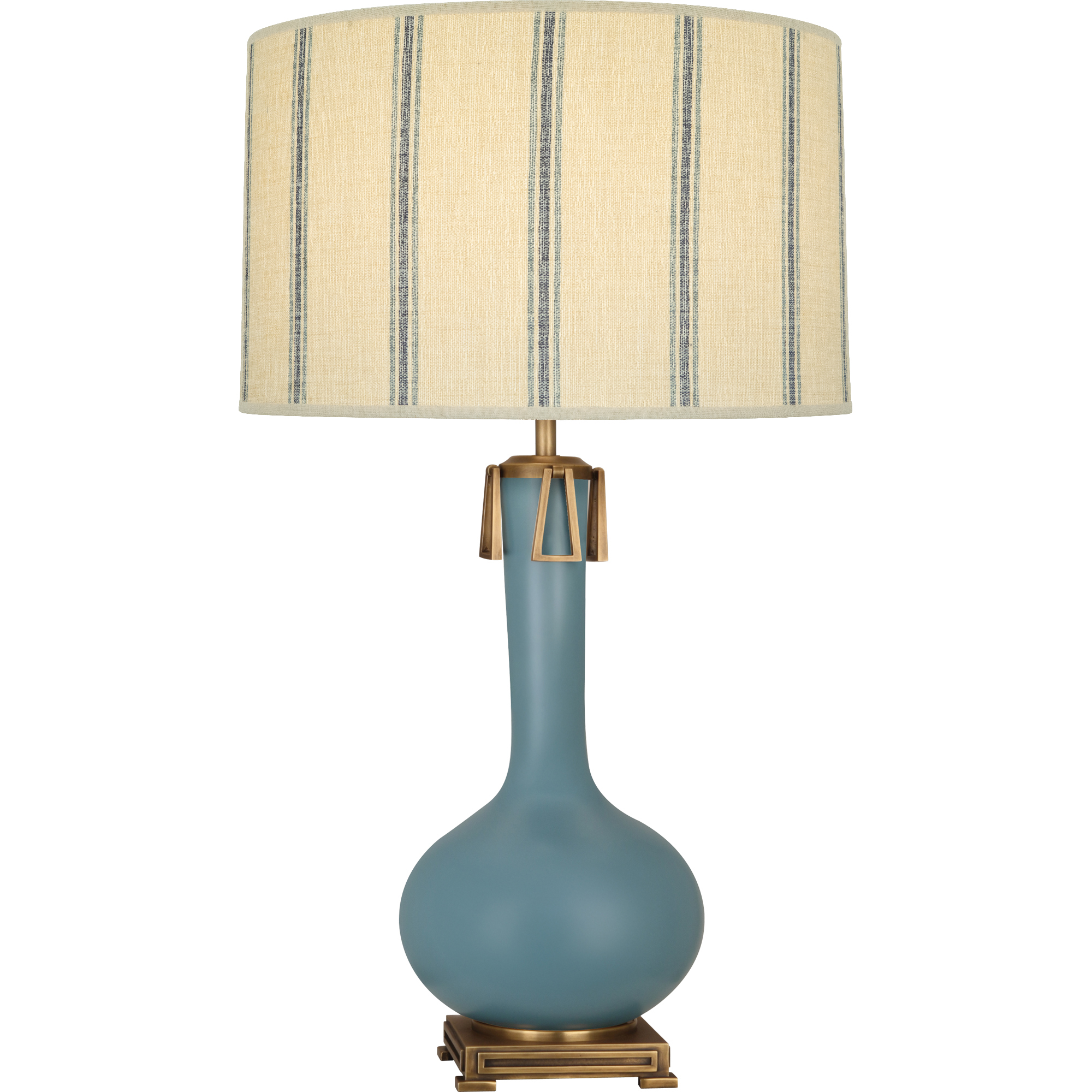 Steel Blue Glazed Ceramic With Aged Brass Accents Athena Table Lamp With Open Weave Heather Linen Shade - Athena combines classic details with a contemporary ceramic body, making this piece truly timeless and versatile!