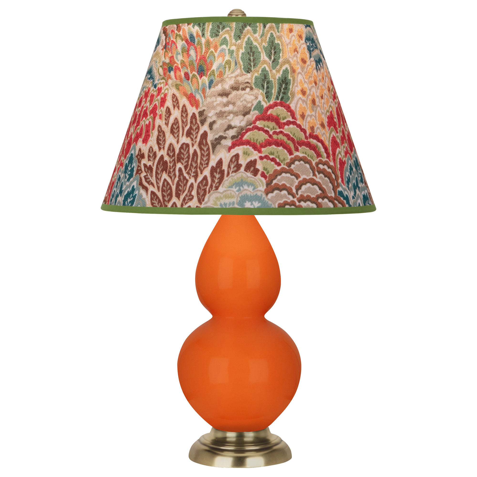 Pumpkin Glazed Ceramic With Antique Natural Brass Finished Accents Small Double Gourd Accent Lamp With Fall Floral Fabric Shade - Our Double Gourd collection features a simple but gracefully curving silhouette. Available in a wide array of vibrant colors and several different base finishes.