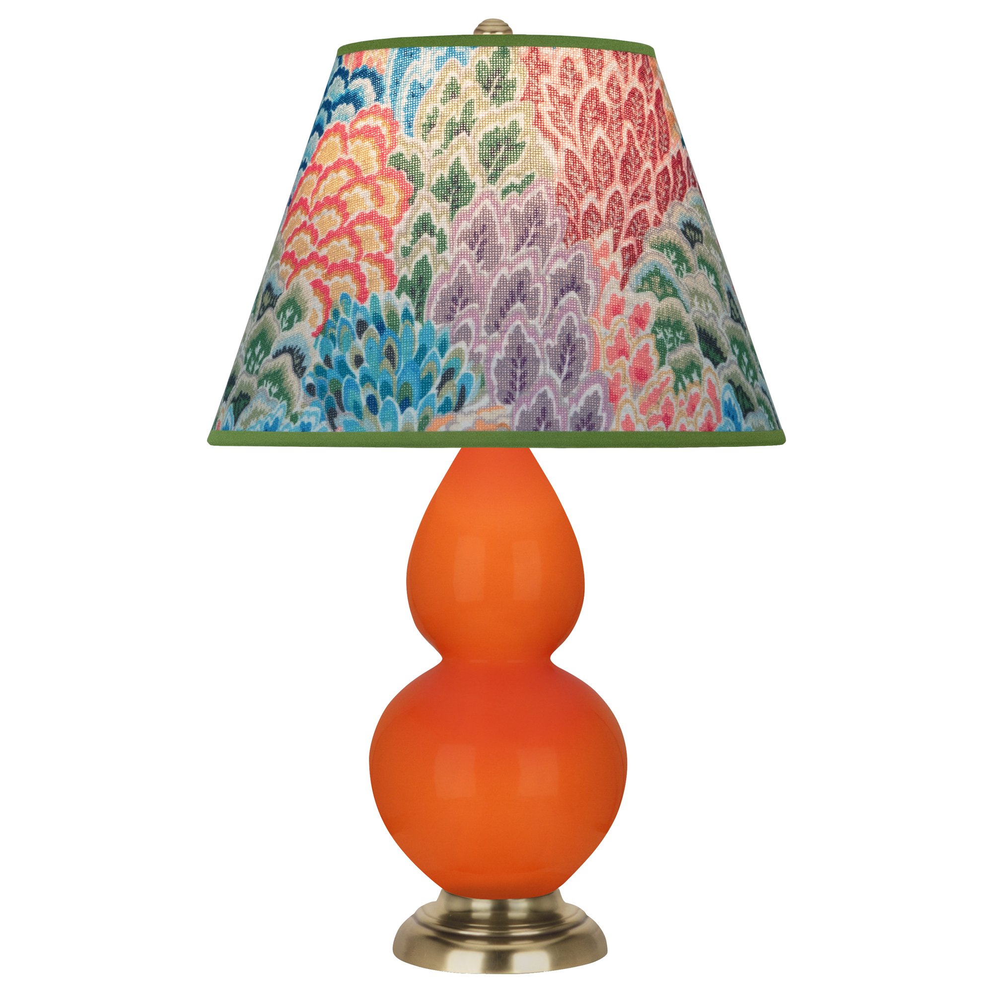 Pumpkin Glazed Ceramic With Antique Natural Brass Finished Accents Small Double Gourd Accent Lamp With Spring Floral Fabric Shade - Our Double Gourd collection features a simple but gracefully curving silhouette. Available in a wide array of vibrant colors and several different base finishes.