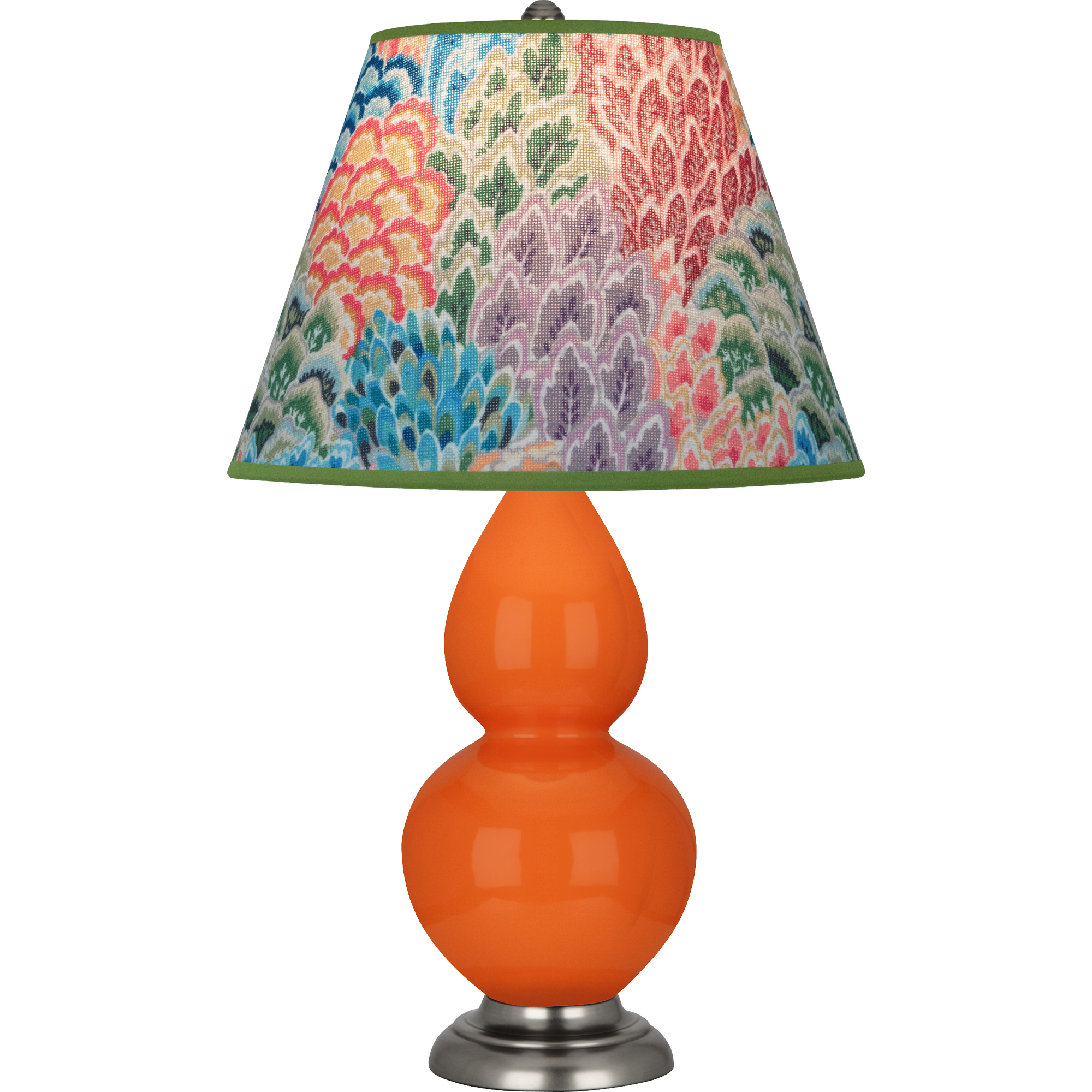 Pumpkin Glazed Ceramic With Antique Silver Finished Accents Small Double Gourd Accent Lamp With Spring Floral Fabric Shade - Our Double Gourd collection features a simple but gracefully curving silhouette. Available in a wide array of vibrant colors and several different base finishes.