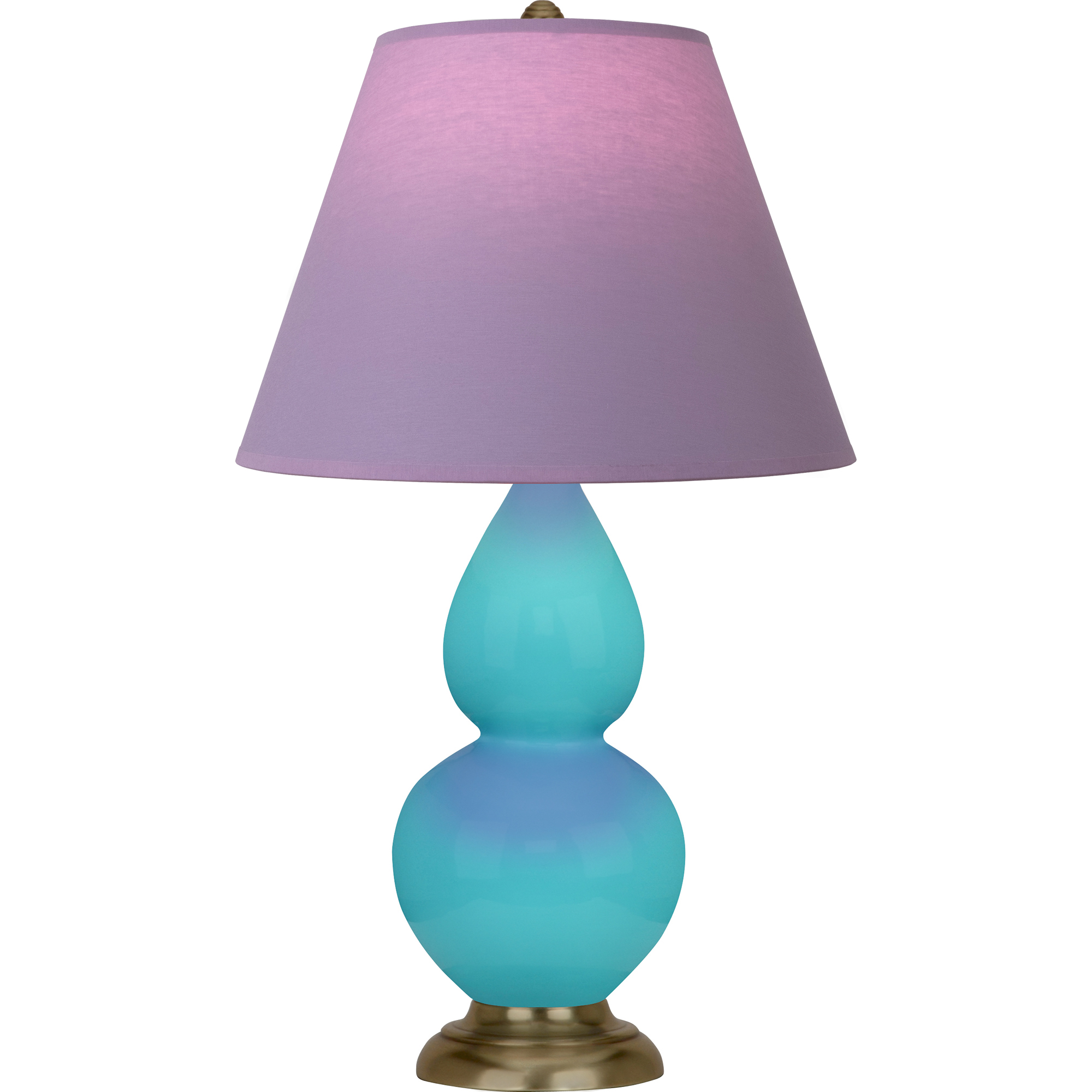Egg Blue Glazed Ceramic With Antique Brass Finished Accents Small Double Gourd Accent Lamp With Lavender Fabric Shade with Plum Lining - Our Double Gourd collection features a simple but gracefully curving silhouette. Available in a wide array of vibrant colors and several different base finishes.
