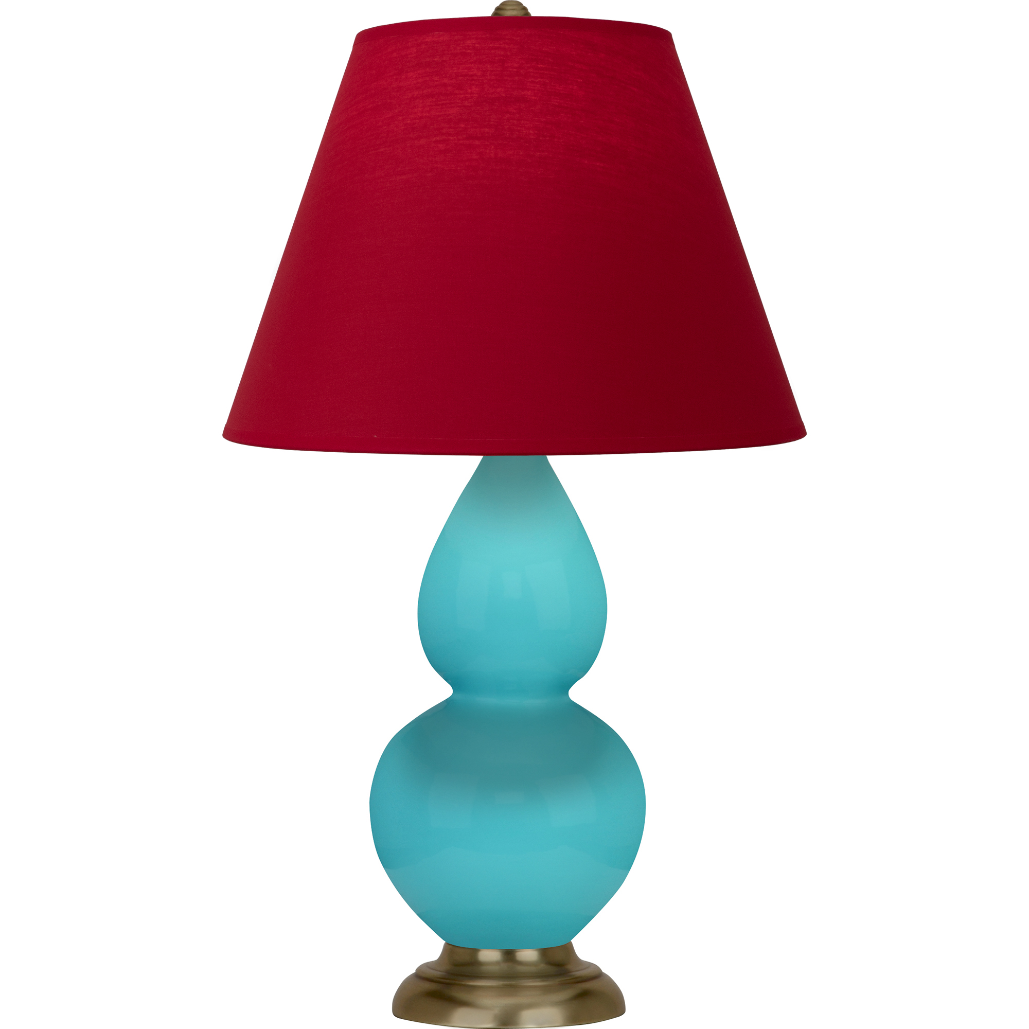 Egg Blue Glazed Ceramic With Antique Natural Brass Finished Accents Small Double Gourd Accent Lamp With Rose Red w/ Ink Lining Fabric Shade - Our Double Gourd collection features a simple but gracefully curving silhouette. Available in a wide array of vibrant colors and several different base finishes.