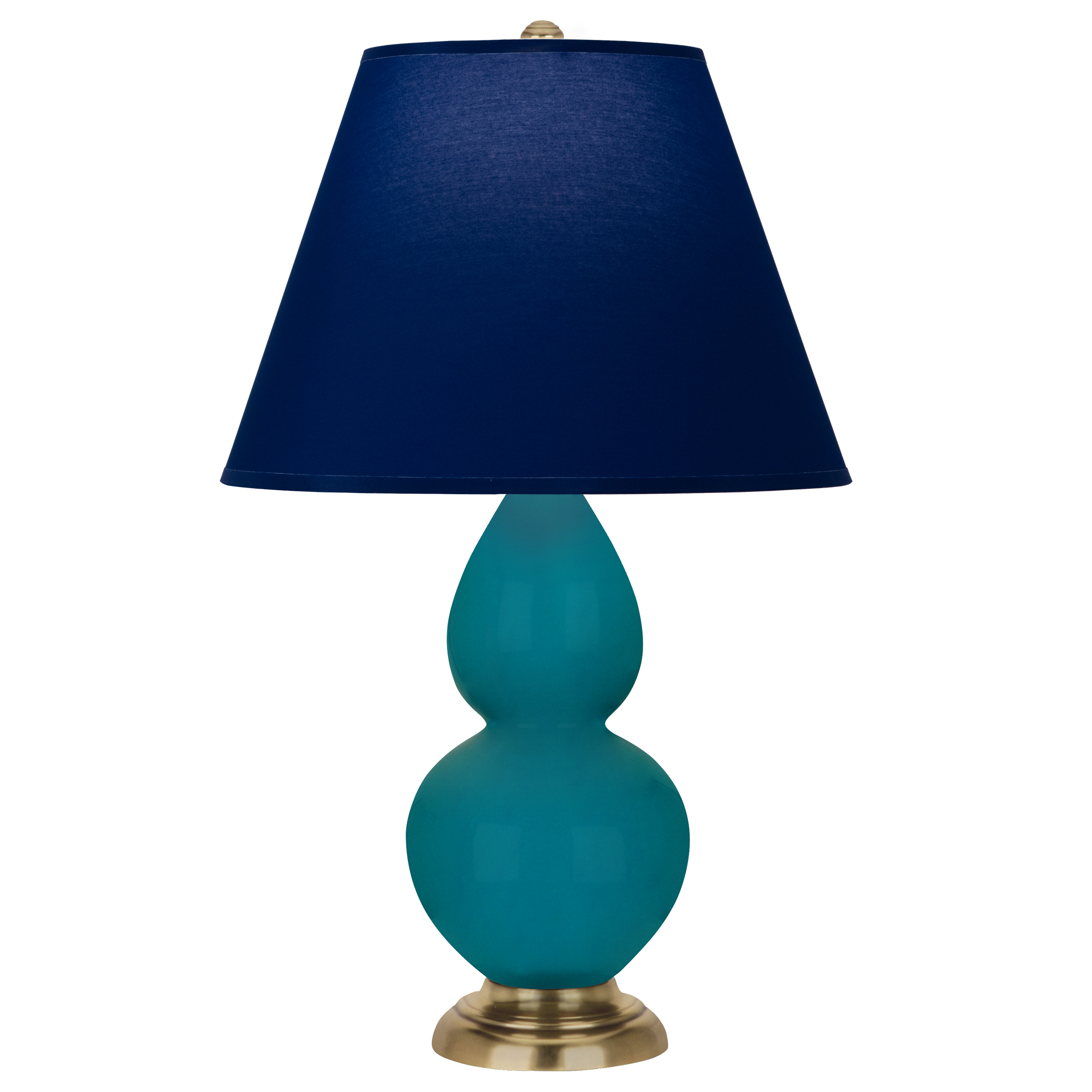 Peacock Glazed Ceramic With Antique Brass Finished Accents Small Double Gourd Accent Lamp With Navy Fabric Shade with Gray Lining - Our Double Gourd collection features a simple but gracefully curving silhouette. Available in a wide array of vibrant colors and several different base finishes.