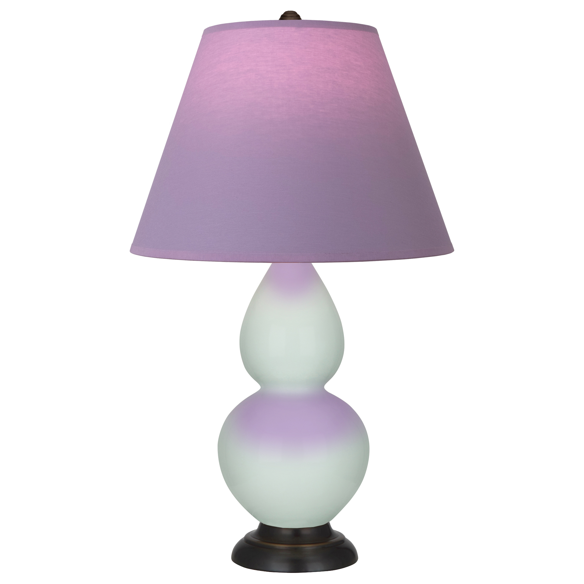 Celadon Glazed Ceramic With Deep Patina Bronze Finished Accents Small Double Gourd Accent Lamp With Lavender Fabric Shade with Plum Lining - Our Double Gourd collection features a simple but gracefully curving silhouette. Available in a wide array of vibrant colors and several different base finishes.