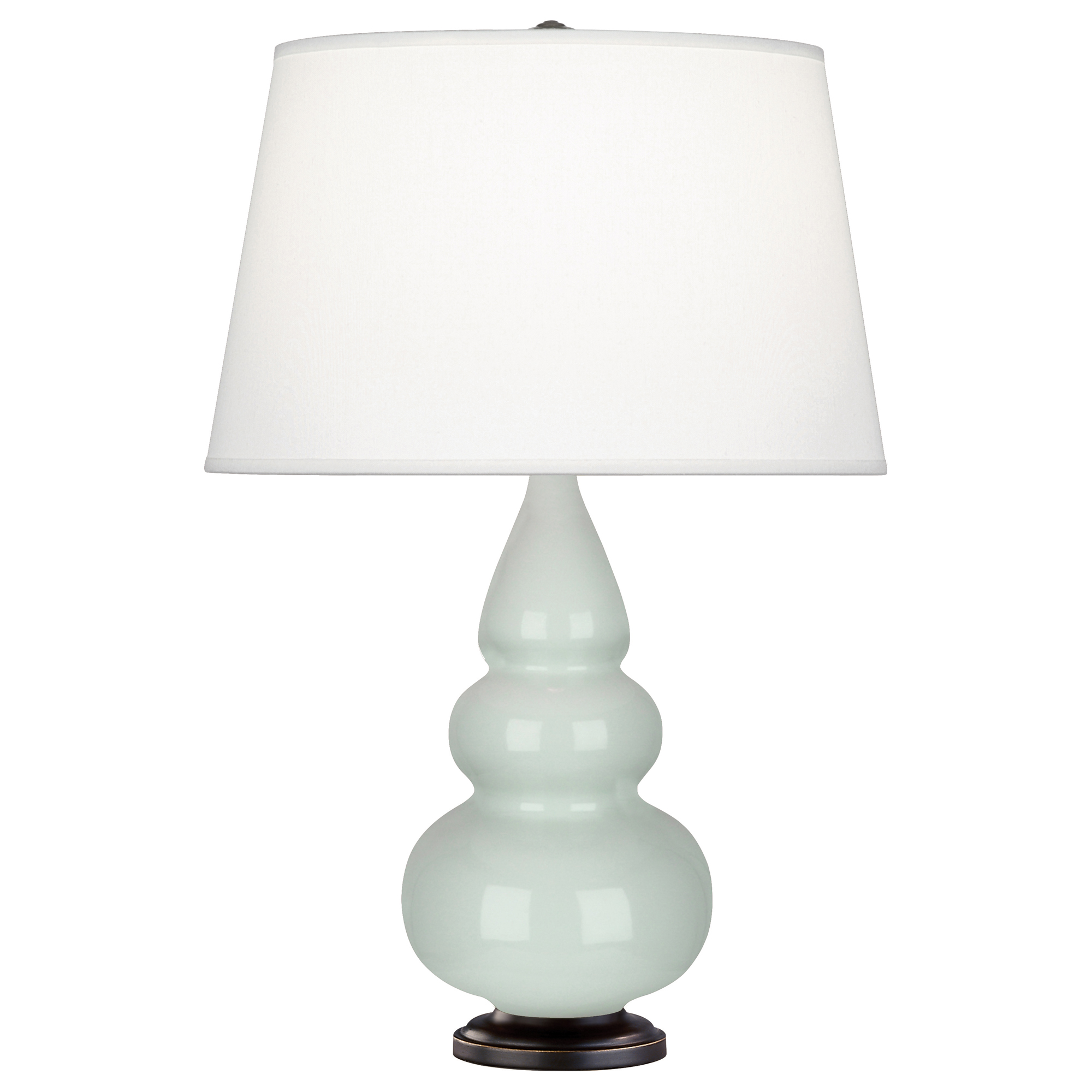 Our Triple Gourd collection features a simple but gracefully curving silhouette. Available in a wide array of vibrant colors and several different base finishes. - Celadon Glazed Ceramic With Deep Patina Bronze Finished Accents Small Triple Gourd Accent Lamp With Pearl Dupioni Fabric Shade
