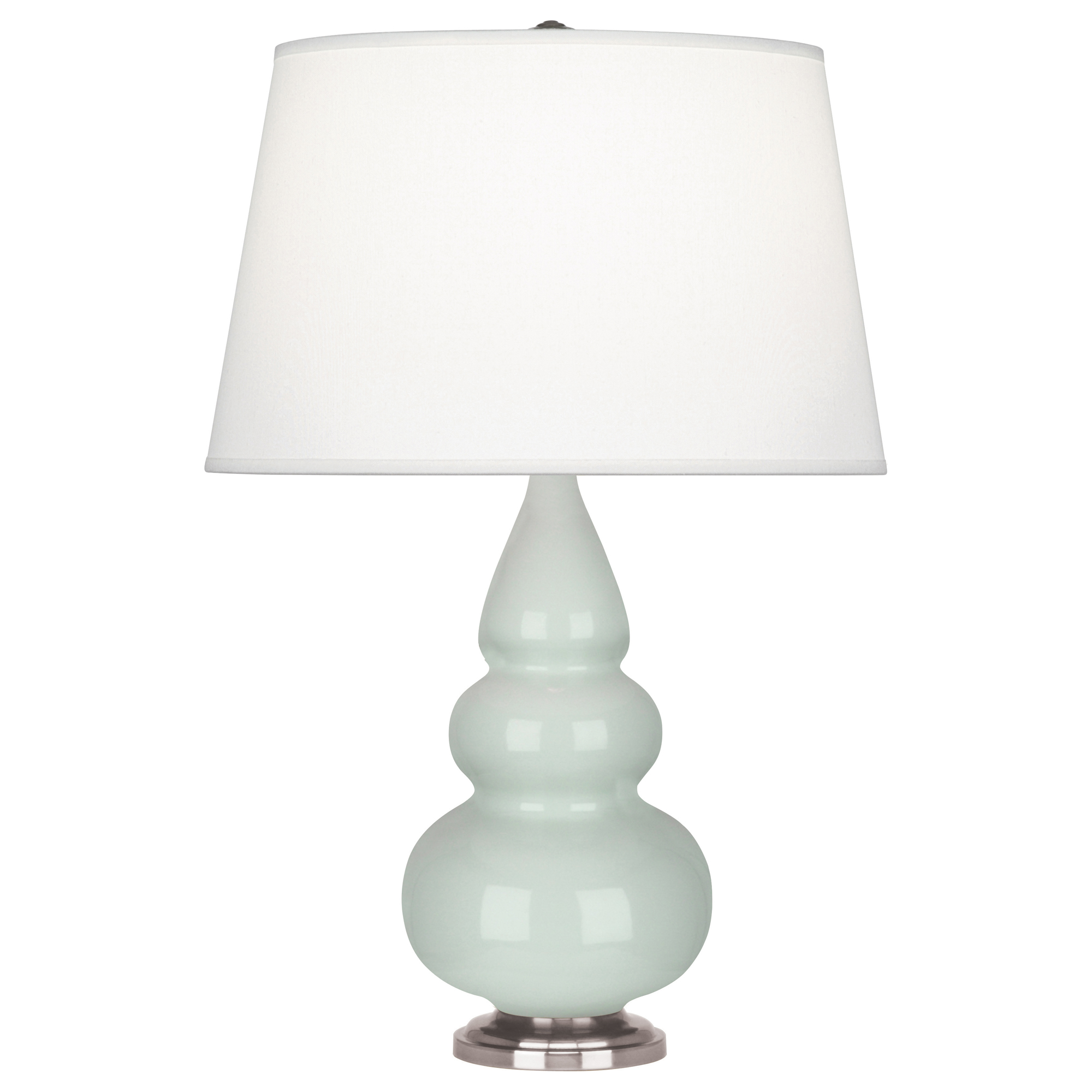 Our Triple Gourd collection features a simple but gracefully curving silhouette. Available in a wide array of vibrant colors and several different base finishes. - Celadon Glazed Ceramic With Antique Silver Finished Accents Small Triple Gourd Accent Lamp With Pearl Dupioni Fabric Shade