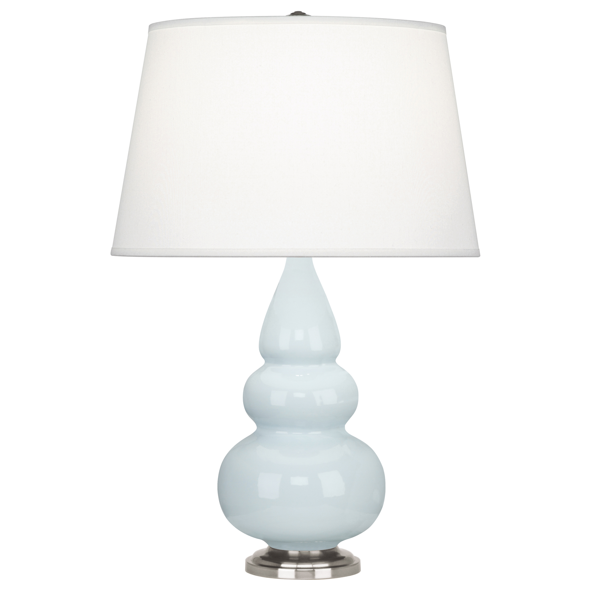 Our Triple Gourd collection features a simple but gracefully curving silhouette. Available in a wide array of vibrant colors and several different base finishes. - Baby Blue Glazed Ceramic With Antique Silver Finished Accents Small Triple Gourd Accent Lamp With Pearl Dupioni Fabric Shade