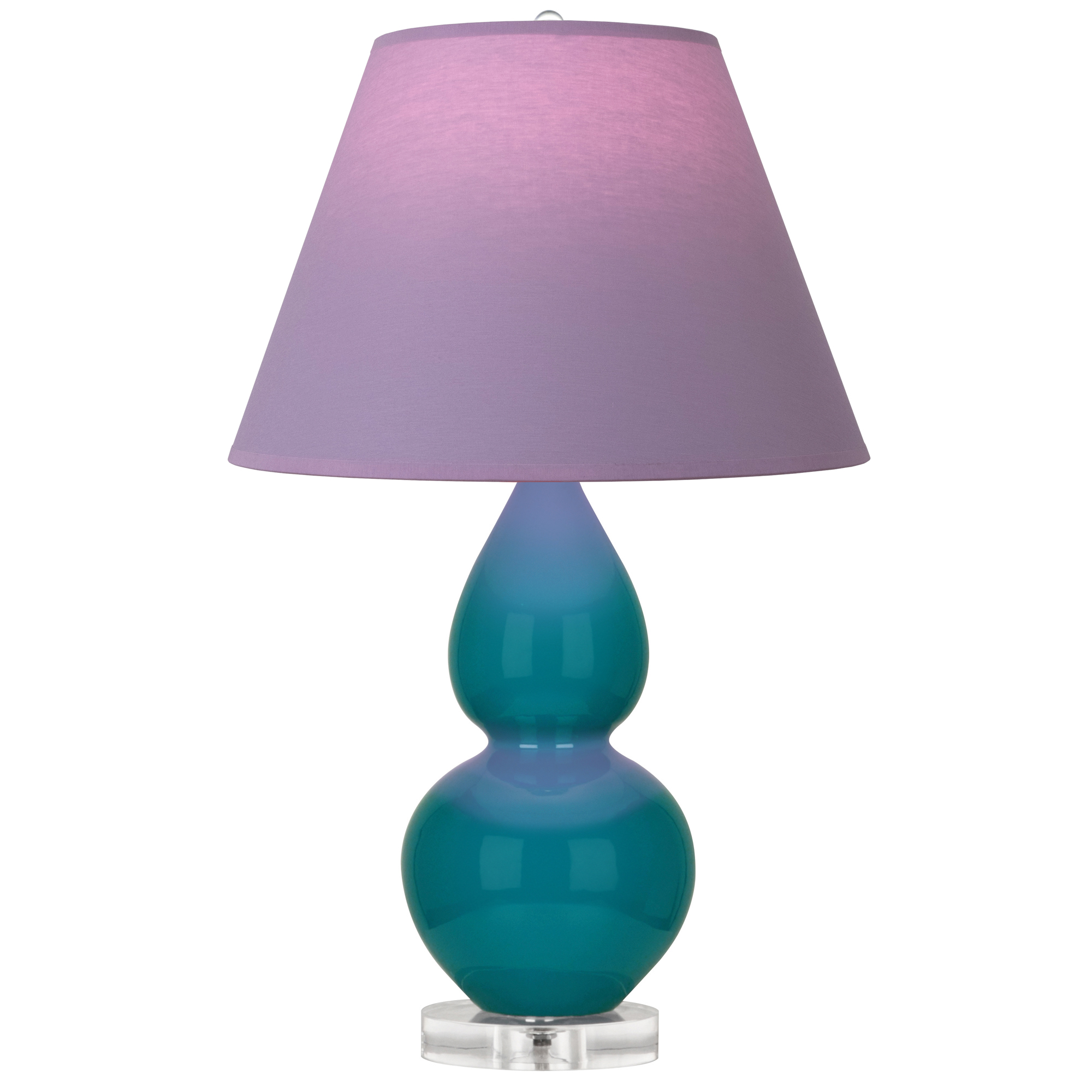 Peacock Glazed Ceramic With Lucite Base Small Double Gourd Accent Lamp With Lavender Fabric Shade with Plum Lining - Our Double Gourd collection features a simple but gracefully curving silhouette. Available in a wide array of vibrant colors and several different base finishes.