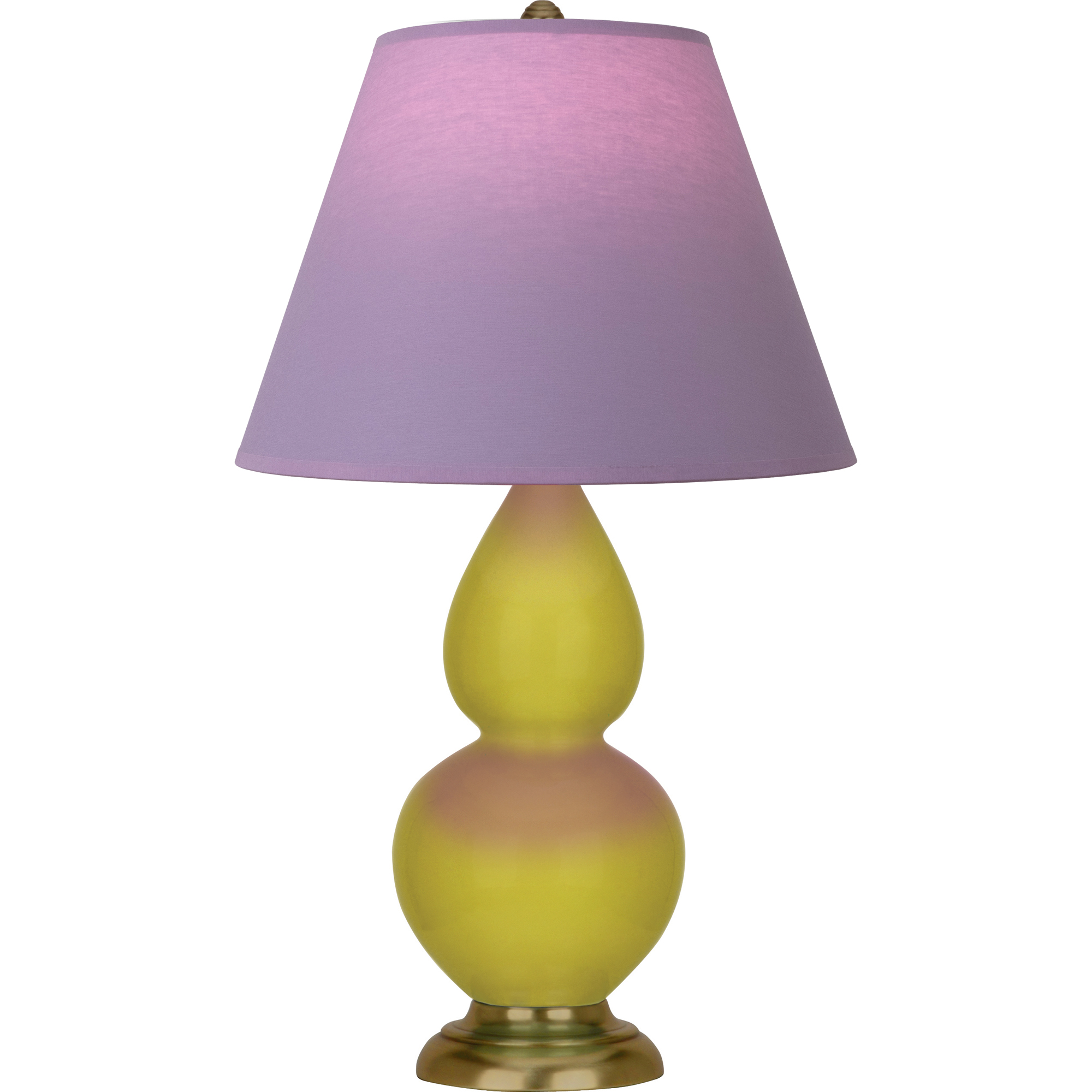 Citron Glazed Ceramic With Antique Brass Finished Accents Small Double Gourd Accent Lamp With Lavender Fabric Shade with Plum Lining - Our Double Gourd collection features a simple but gracefully curving silhouette. Available in a wide array of vibrant colors and several different base finishes.