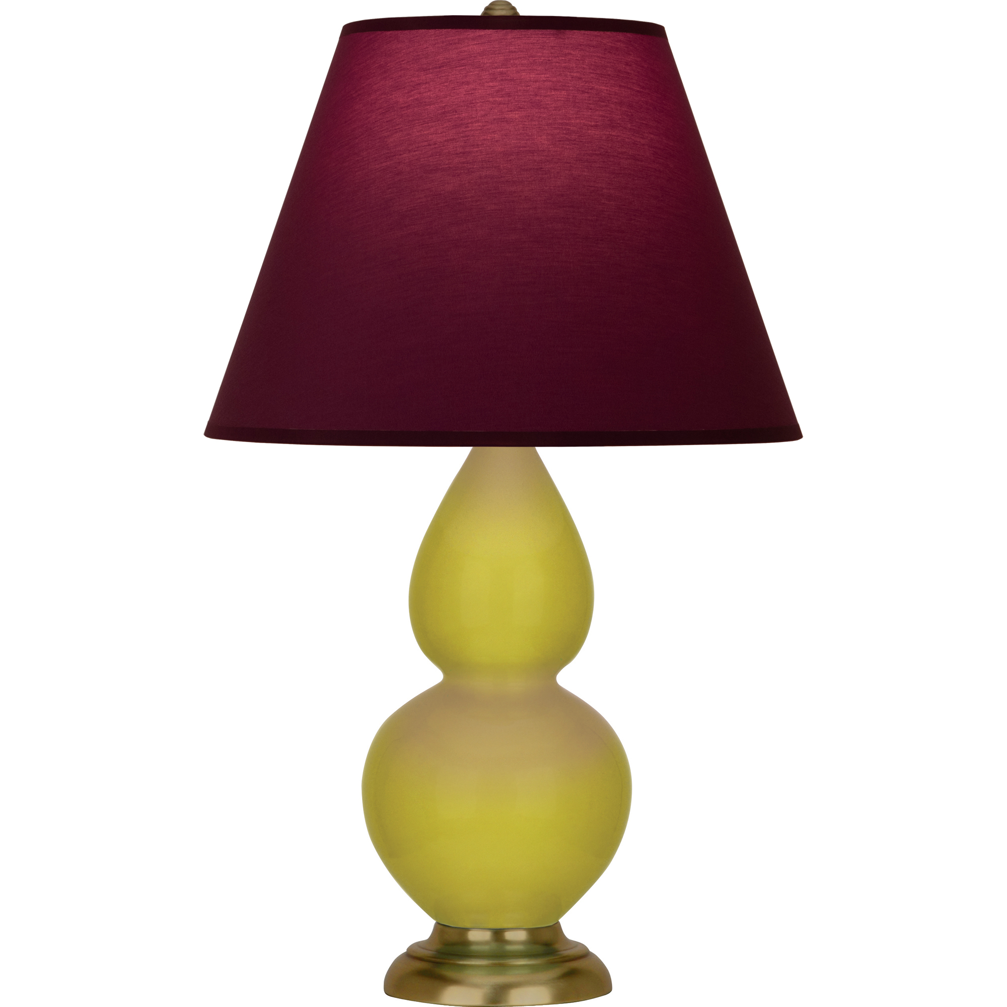 Citron Glazed Ceramic With Antique Brass Finished Accents Small Double Gourd Accent Lamp With Plum Fabric Shade with Lavender Lining - Our Double Gourd collection features a simple but gracefully curving silhouette. Available in a wide array of vibrant colors and several different base finishes.