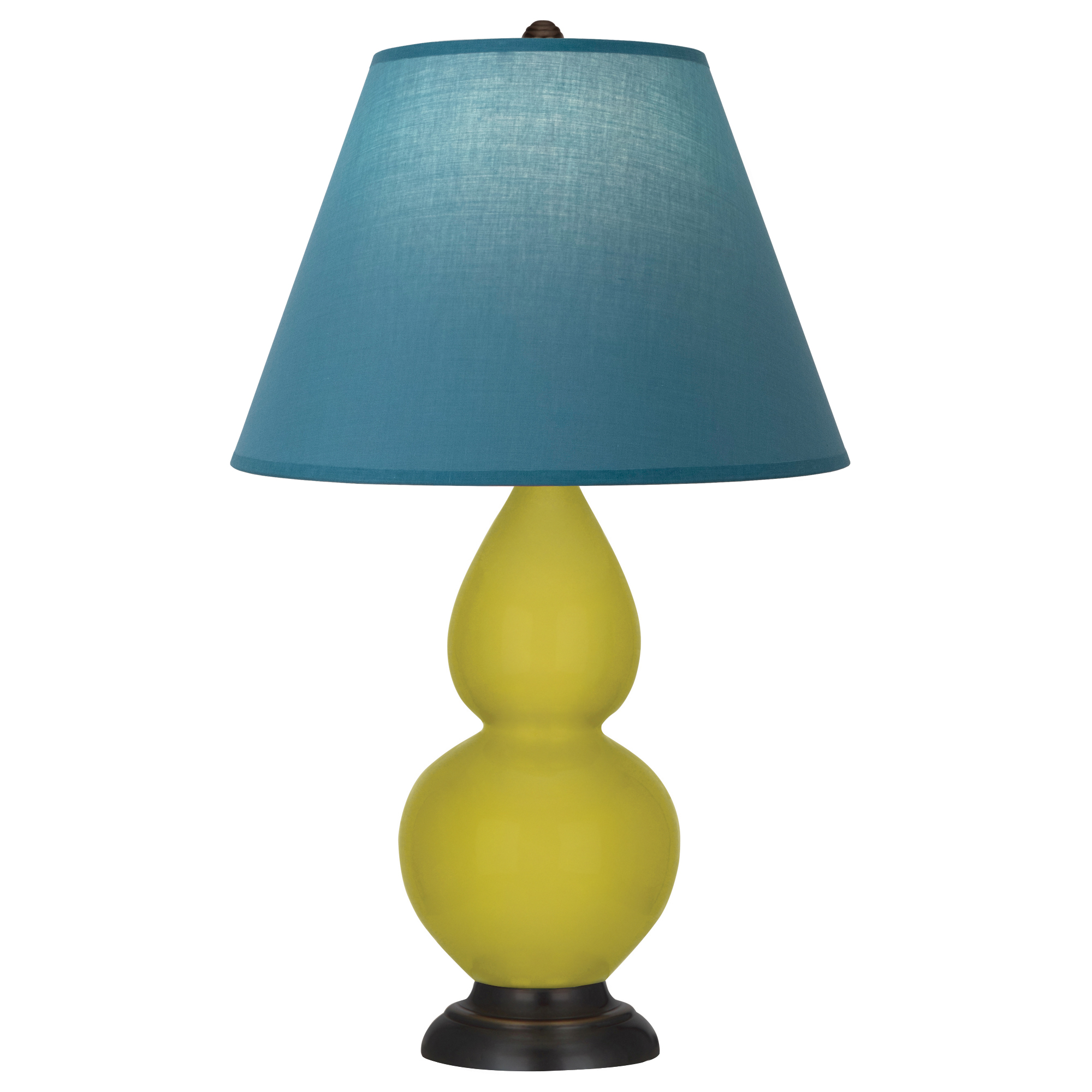 Citron Glazed Ceramic With Deep Patina Bronze Finished Accents Double Gourd Table Lamp With Bright Blue Fabric Shade with Gray Lining - Our Double Gourd collection features a simple but gracefully curving silhouette. Available in a wide array of vibrant colors and several different base finishes.