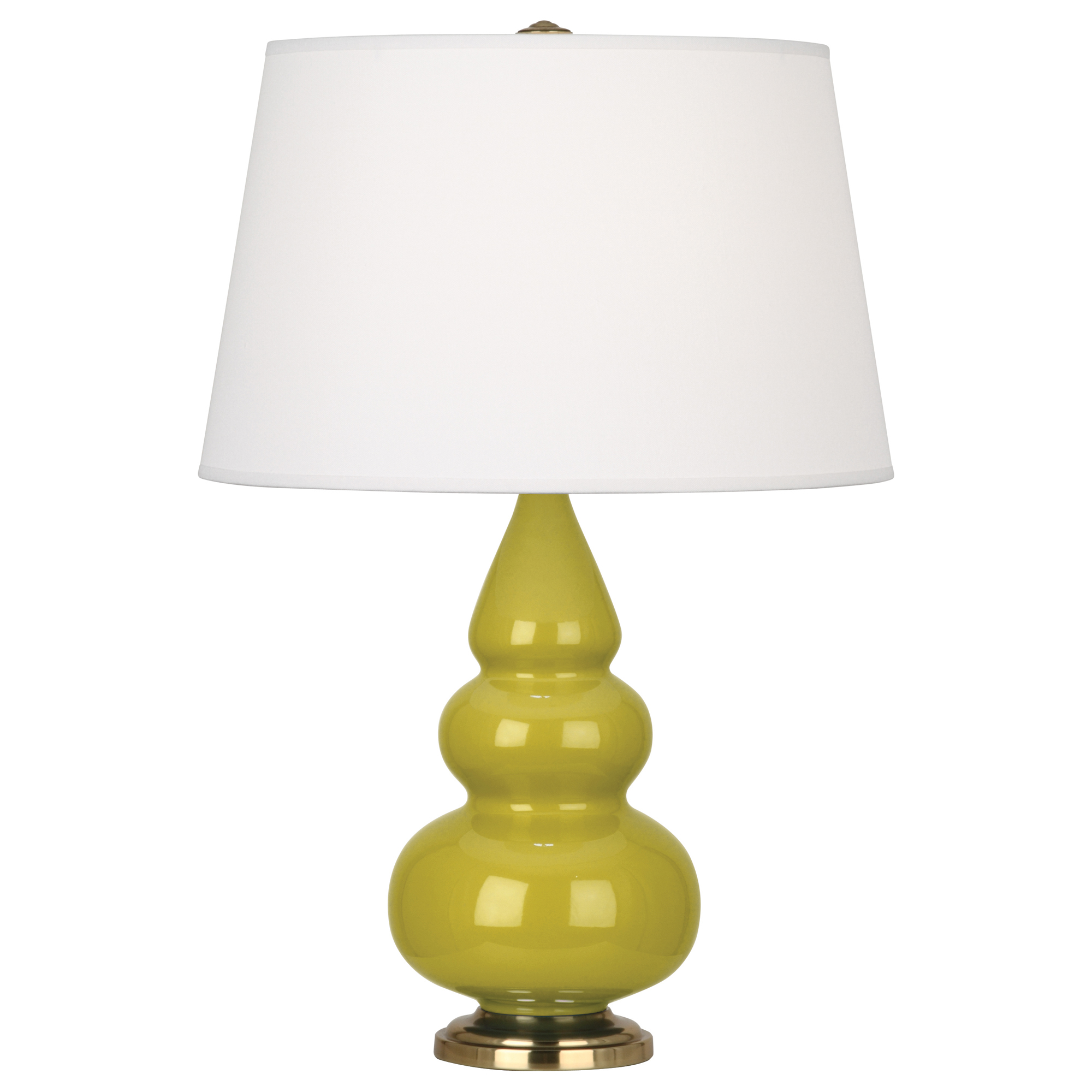 Our Triple Gourd collection features a simple but gracefully curving silhouette. Available in a wide array of vibrant colors and several different base finishes. - Citron Glazed Ceramic With Antique Brass Finished Accents Small Triple Gourd Accent Lamp With Pearl Dupioni Fabric Shade