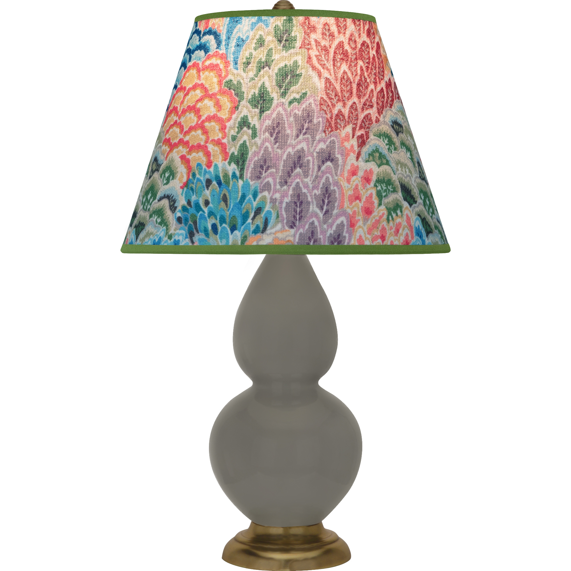 Ash Glazed Ceramic With Antique Brass Finished Accents Small Double Gourd Accent Lamp With Spring Floral Fabric Shade - Our Double Gourd collection features a simple but gracefully curving silhouette. Available in a wide array of vibrant colors and several different base finishes.