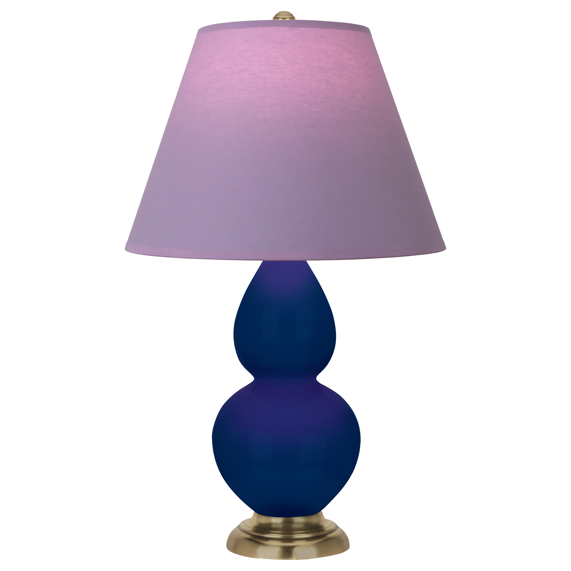 Cobalt Glazed Ceramic With Antique Brass Finished Accents Small Double Gourd Accent Lamp With Lavender Fabric Shade with Plum Lining - Our Double Gourd collection features a simple but gracefully curving silhouette. Available in a wide array of vibrant colors and several different base finishes.