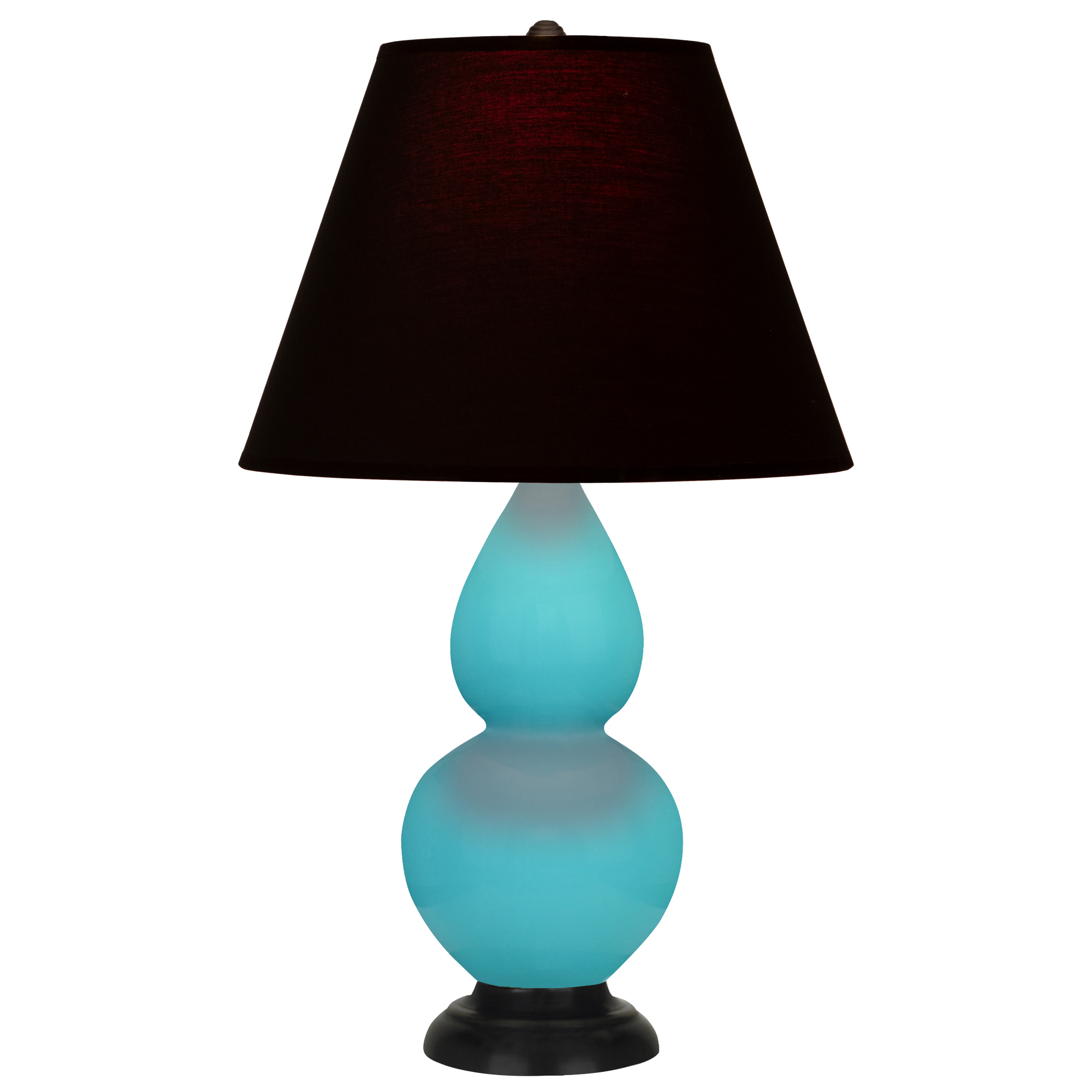 Egg Blue Glazed Ceramic With Deep Patina Bronze Finished Accents Small Double Gourd Accent Lamp With Ink Fabric Shade with Rose Red Lining - Our Double Gourd collection features a simple but gracefully curving silhouette. Available in a wide array of vibrant colors and several different base finishes.