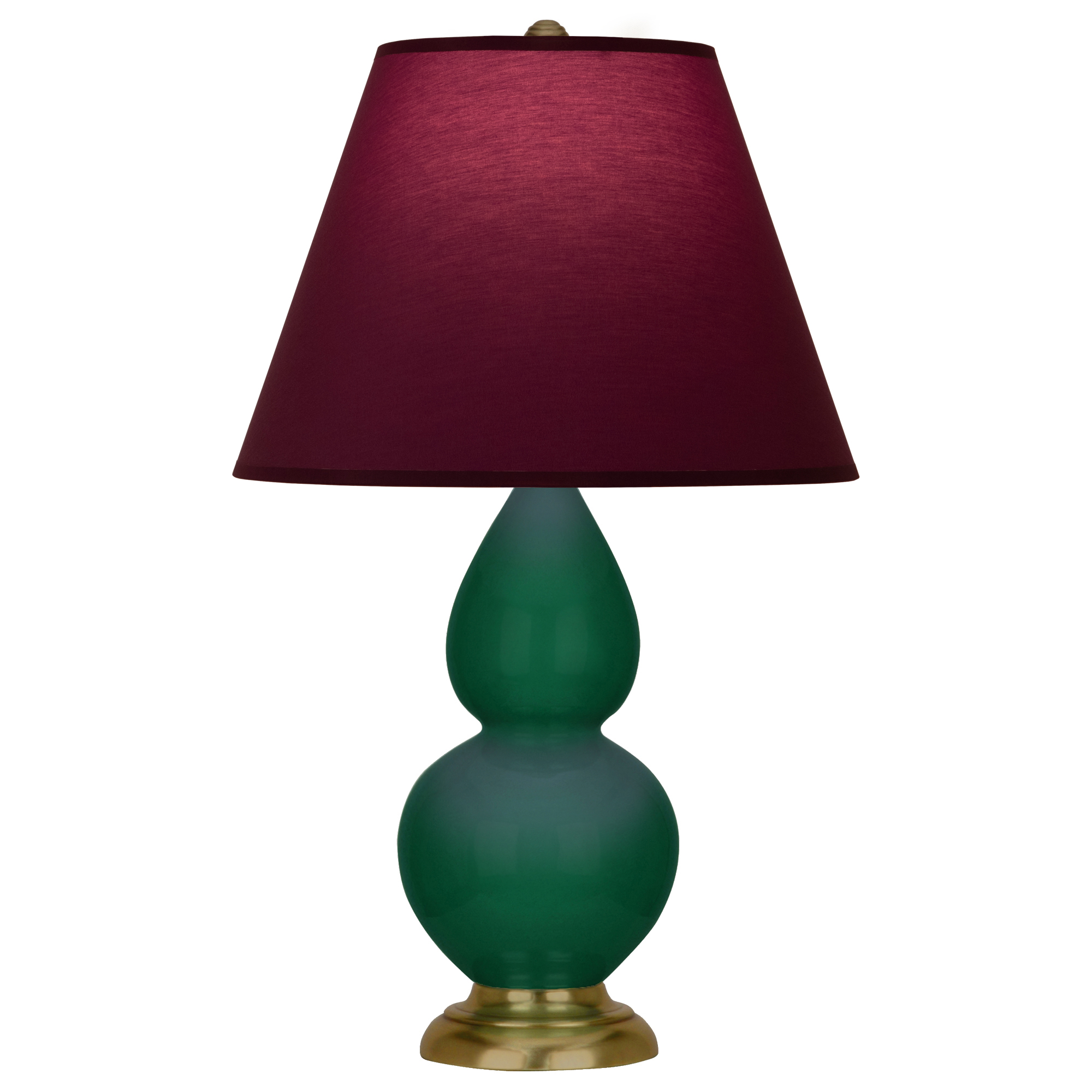 Jungle Glazed Ceramic With Antique Brass Finished Accents Small Double Gourd Accent Lamp With Plum Fabric Shade with Lavender Lining - Our Double Gourd collection features a simple but gracefully curving silhouette. Available in a wide array of vibrant colors and several different base finishes.