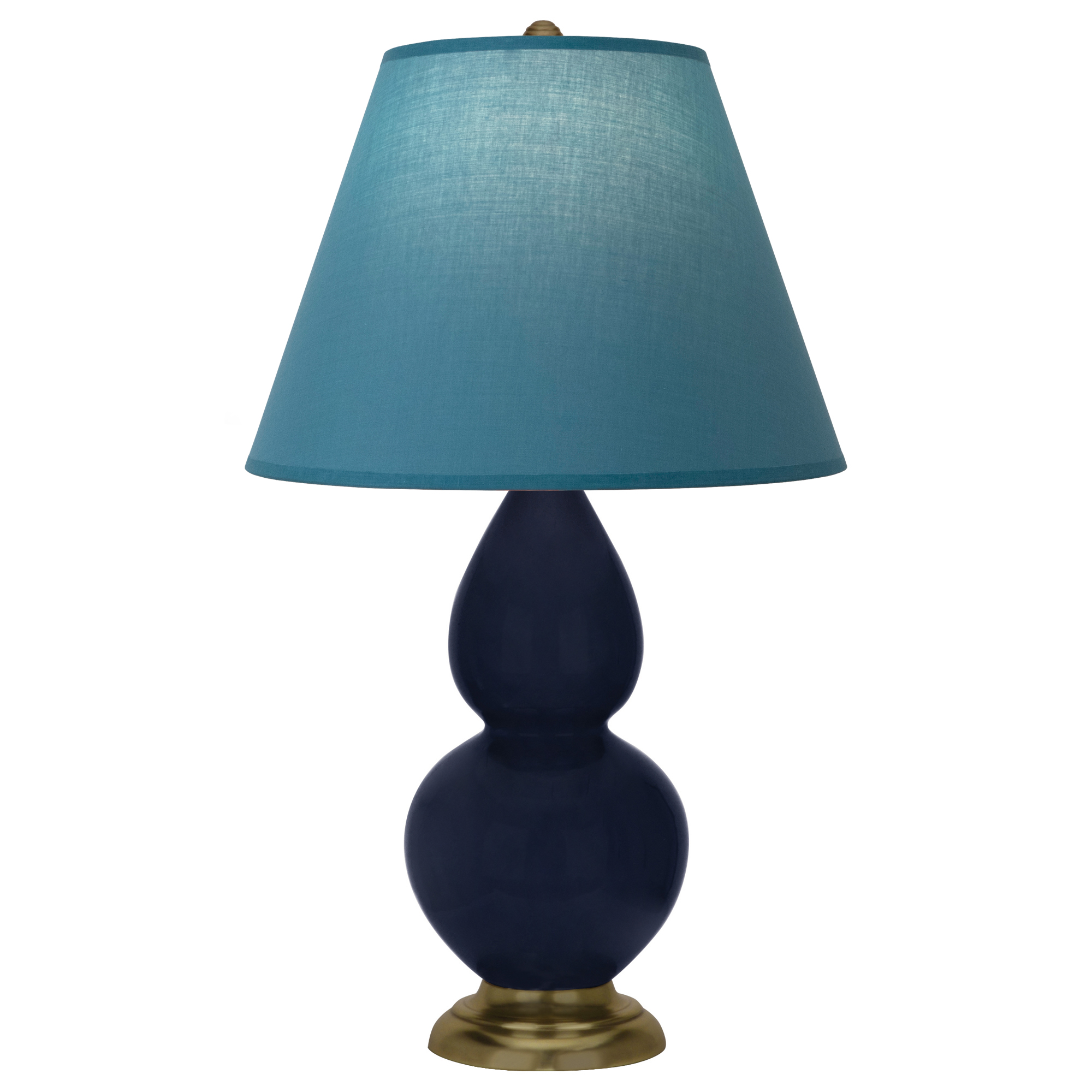 Midnight Blue Glazed Ceramic With Antique Natural Brass Finished Accents Double Gourd Table Lamp With Bright Blue Fabric Shade with Gray Lining - Our Double Gourd collection features a simple but gracefully curving silhouette. Available in a wide array of vibrant colors and several different base finishes.